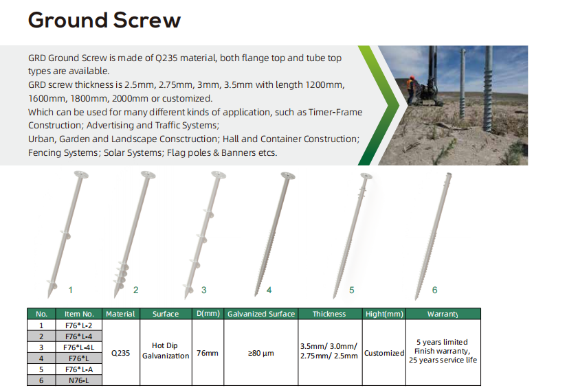 Parafuso de aterramento Fundação: Este é um tipo de fundação utilizada para fixar e suportar suportes de painéis fotovoltaicos (PV). Ela proporciona suporte estável para os suportes dos painéis fotovoltaicos através da fixação de estacas metálicas helicoidais no solo. As fundações com estacas helicoidais são vantajosas devido à sua rápida instalação e mínimo impacto ambiental. Sua estrutura consiste principalmente em um corpo de estaca helicoidal e componentes de conexão. O corpo da estaca é helicoidal, com lâminas helicoidais na extremidade, o que ajuda a proporcionar aderência e estabilidade quando parafusada no solo.